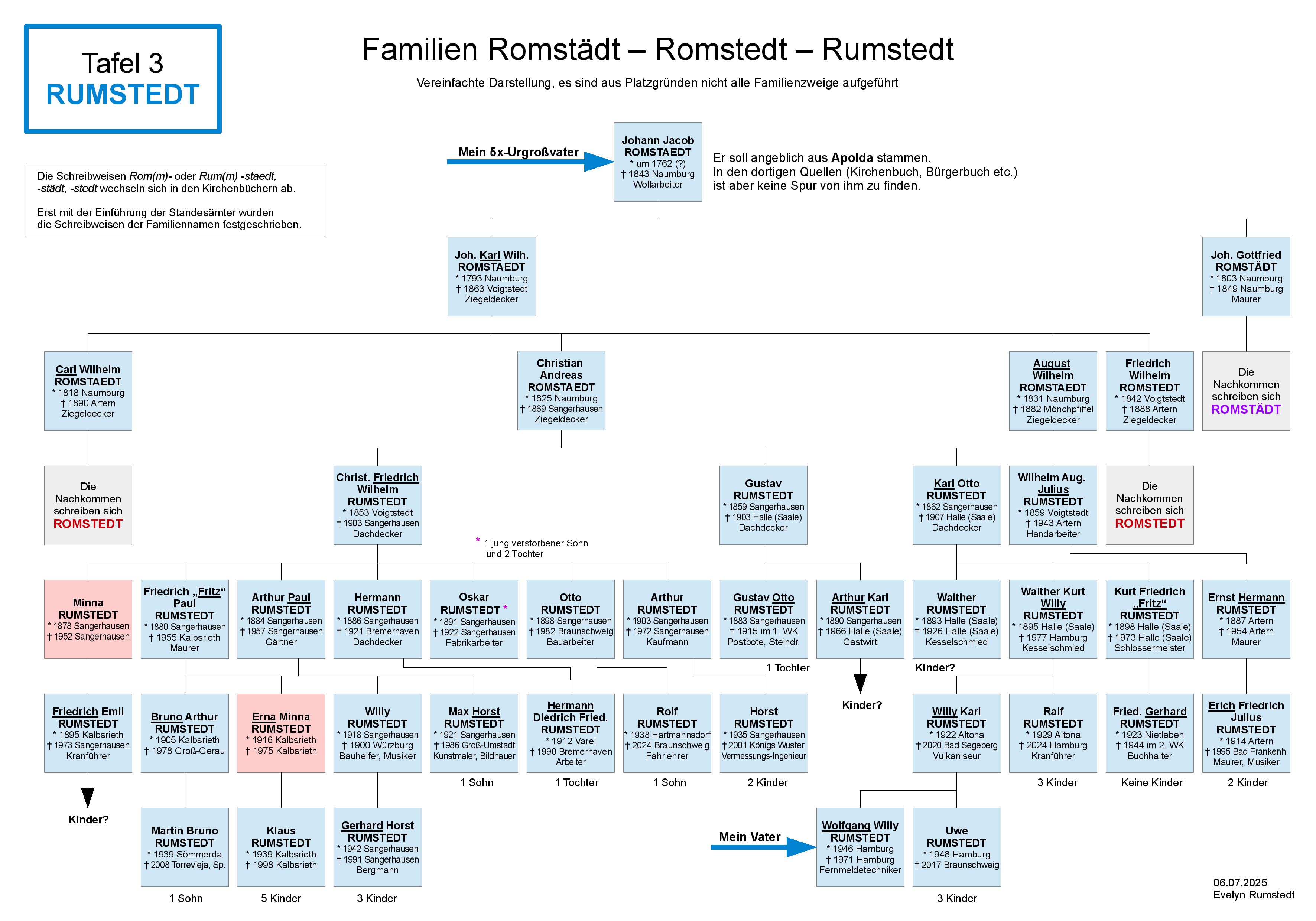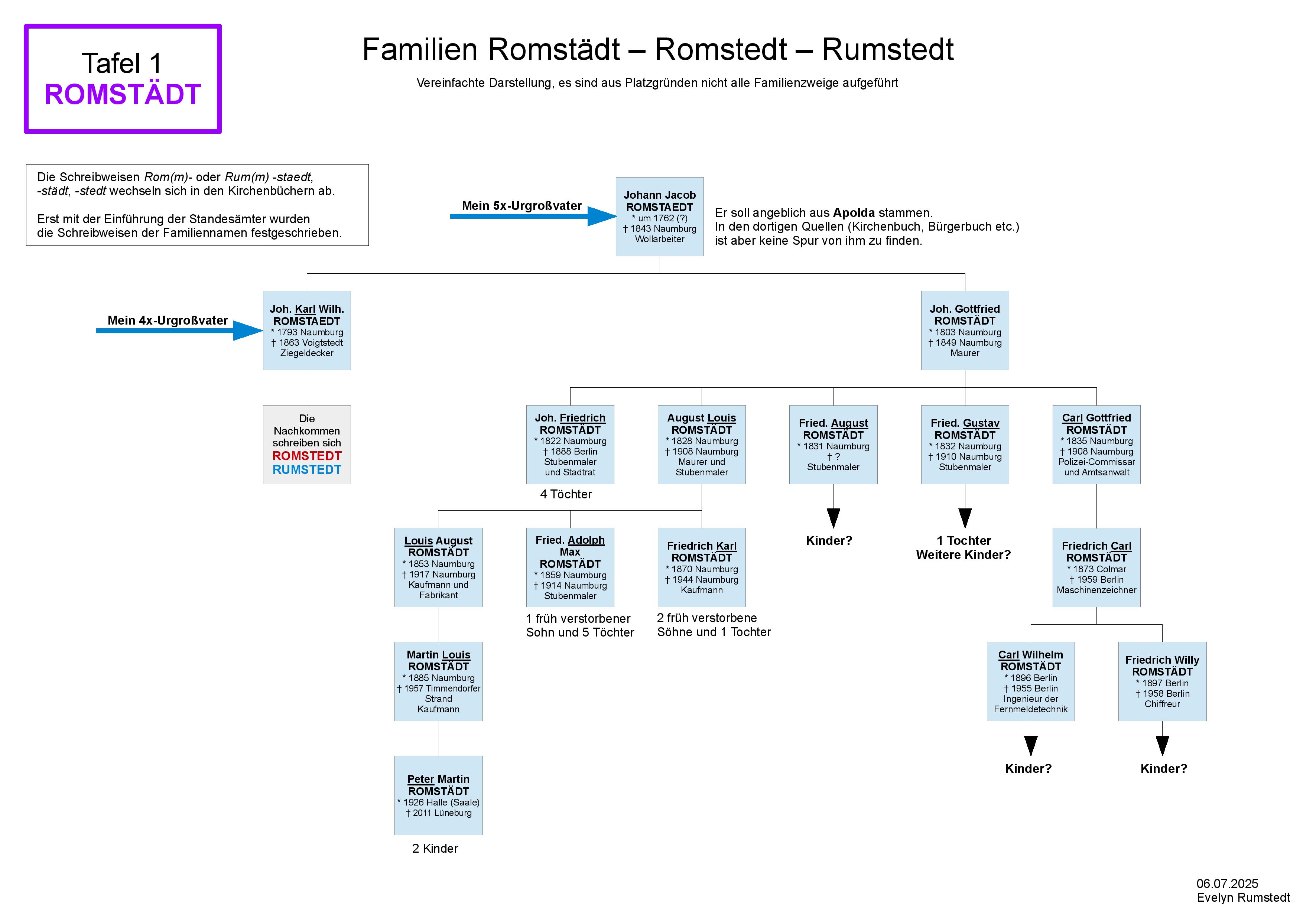 Die Schreibweisen der Familiennamen war in früheren Zeiten noch nicht so festgeschrieben wie heute. So heißt mein ältester bekannter Vorfahre, der Wollarbeiter Johann Jacob R., in den Kirchenbucheinträgen in Naumburg mal Rom(m)staedt, Rom(m)städt oder auch Rum(m)staedt. Auch bei den Einträgen seiner Nachkommen wechseln sich die unterschiedlichen Schreibweisen ab. Bitte siehe auch die Nachfahrenliste von Johann Jacob Romstaedt.